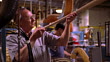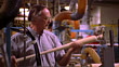 Medium shot pan man examining baseball bat in Louisville Slugger Factory / Kentucky - HD stock video