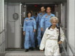 1983 medium shot pan STS 7 crew including Sally Ride waving and walking to shuttle / Cape Canaveral, Florida