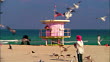 Medium shot pink lifeguard post on beach / woman feeding seagulls / Miami Beach, Florida - HD stock video