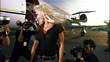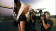 Medium shot Rock star posing and shaking hair toward paparazzi photographers near private airplane / Long Beach, California, USA - HD stock video