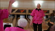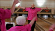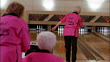 Medium shot senior woman bowling and missing pins / turning + smiling w/teammates - HD stock video