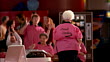 Medium shot senior woman in 'Pink Ladies' team jersey bowling and cheering w/teammates - HD stock video