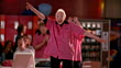 Medium shot senior woman in 'Pink Ladies' jersey bowling and dancing - HD stock video