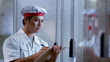 Medium shot technician inspecting aseptic packaging chamber at milk processing plant / Bandung, Indonesia - HD stock video