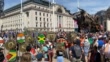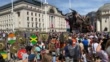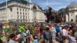 BIRMINGHAM, ENGLAND - AUGUST 7: Members of the public stand behind a gate with insignias as they view the giant mechanical bull on day ten of the Birmingham 2022 Commonwealth Games in Birmingham's Centenary Square on August 7, 2022 on the Birmingham, England. (Footage by Al Bello/Getty Images)