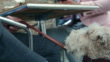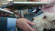 Two men sitting at a table at an outdoor cafe with their Wire Fox Terrier in London, England.