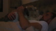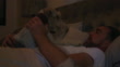 Man lying in bed, being woken up by his Wire Fox Terrier in the morning.