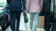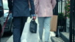 Mixed race homosexual couple carrying shopping bags, walking down street with their Wire Fox Terrier in London, England.