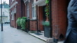 Man wearing grey suit walking down street with Wire Fox Terrier in London, England.