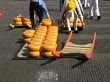 Men carrying large cheese rounds in historical cheese market, Alkmaar, Holland - stock video