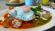 Mexican breakfast chilaquiles with red and green spicy sauce and egg