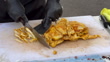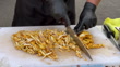 Mexican cook chopping grilled chicken meat to be used for chicken tacos at a street taco shop