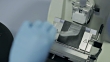This video is a high-angle, handheld close-up of a microtomist using a microtome to cut thin slices of tissue for sampling