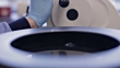 This video is a handheld close-up of a microtomist operating a microtome with a focus pull and tilt to a tissue sample in a tissue float bath