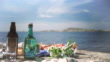 Picnic with lobsters and shrimps in on an island