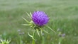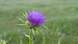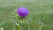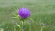 Pink flowering thistle Cardus marianus or St. Mary's thistle (Silybum marianum) on a background of fuzzy greens. Milk thistle is valuable plant used for medicinal purposes. Selective close-up focus - Valladolid . Spain
