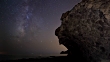Volcanic rock formation in the foreground on the edge of the Mediterranean Sea.Time lapse night with the Milky Way background. Night sky full of stars moving. Pictures taken on the beach Monsul in the Natural Park of Cabo de Gata in the province of Almeria, Andalusia, Spain.