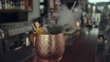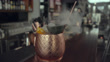 Mint julep in a copper jug on bar counter, full of crushed dried ice, steaming through special funnel