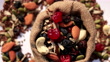 Mixed dried fruit filled in burlap sack table top spin isolated on white background - 4K stock video