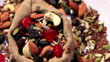 Mixed dried fruit filled in burlap sack table top spin isolated on white background - 4K stock video