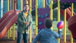 A 10 year old boy on a playground playing catch with his father. The view is from over the boy's shoulder. Dad is African-American and his son is mixed race African-American and Hispanic.