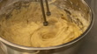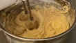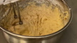 High angle close-up shot of a banana bread batter being mixed inside aluminum bowl in domestic kitchen