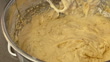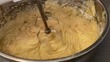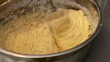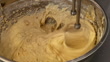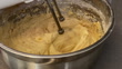 High angle close-up shot of a banana bread batter being mixed inside aluminum bowl in domestic kitchen