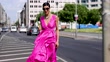 BERLIN, GERMANY - JUNE 27: (SLOW-MO) Model and artist Zoe Helali wearing a pink colored dress by Talbot und Runhof, jewelry by Davide Juwel, silver vintage pumps and sunglasses by Lunettes Selection Berlin during a street style shooting on June 27, 2021 in Berlin, Germany. (Footage by Streetstyleshooters/Getty Images)