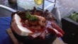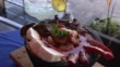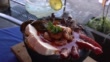 A delicious bowl of shrimp, chorizo, sausage and cooled cactus in a bubbly enchilada and cheese sauce with a Margarita, a plate of octopus, rice and mashed potato