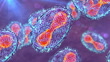 Animated of monkeypox virus particles. The virus has a core (red) that contains its double-stranded DNA genome. Around this is a protein coat and an outer envelope. It is a large virus, with dimensions of 250x200 nanometres. Infection causes the contagious disease monkeypox, which causes fever followed by a rash, like a milder version of the related smallpox. It is endemic to west and central Africa, but can cause outbreaks in other regions