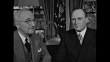 Montage 2-shots US President Harry Truman and Crown Prince Olav of Norway smile and chat as they sit at Truman's desk in the Oval Office during the Prince's visit to Washington, DC / Wilhelm Munthe de Morgenstierne, Norwegian Ambassador to the US, stands behind Truman and the Prince as flashbulbs pop
