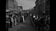 montage South Dakota city, includes panorama and aerial views / LS spectators in period costume line streets as parade for film premiere of 'Calamity Jane' begins with a horse-drawn carriage carrying Queen of Spearfish / women ride on horseback ahead of a horse-drawn buggy as they approach camera, passing the Homestake Theatre, where the film will premiere in the Black Hills area / man drives horse-drawn wagon as its passengers, a group of women, wave to onlookers along street as they approach; some spectators wave their hats at the women / horse-drawn buggy passes theater / man on horseback tips his hat as he approaches camera / man dressed as cowboy rides horse toward camera; horse prances and acts as if it is about to misbehave / MS EXT Homestake Theatre with sign touting the film premiere / buggy with sign 'Welcome Queen of Belle Fourche' / theater entrance with signs about premiere / evening: onlookers along street, dressed in contemporary clothing, wave / day: horseback rider carries US flag past the Homestake Theatre, followed by another rider with a different flag; brass band, led by baton-twirling majorette dressed as a cowgirl, approaches / dark shot crowd / majorette and brass band approach / horses approach, drawing a stagecoach marked 'Deadwood Cheyenne Stage Coach'; men ride atop it as well as Calamity Jane and Wild Bill Hickok impersonators / men assist passengers out of the stagecoach