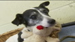 Small white mongrel dog with black patches (called 'Lady') sitting in dog basket with reindeer toy