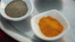 TALIOUINE, MOROCCO - 26th October 2015 - Close-up of two small white ramekin plates with paprika and saffron ready to prepare a saffron infused tajine, Taliouine, Souss Massa Draa, Southern Morocco, North Africa