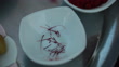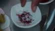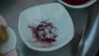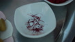 TALIOUINE, MOROCCO - 26th October 2015 - Close-up of unrecognisable cook's hand taking a pinch of saffron from a small white ramekin plate to prepare a saffron infused tajine, Taliouine, Souss Massa Draa, Southern Morocco, North Africa