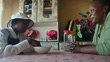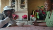 Mother and daughter in rural home kitchen sitting at table having lunch pouring water eating with her hand - 4K stock video