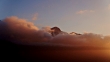 Drone shot zooming toward a rocky mountain peak through poofy cumulus clouds as orange light defracts through the haze.