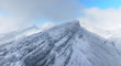 Mountain, snow or ice with high cliff, cloudy sky or rock and slope of natural environment, forest or nature. Aerial view, drone or hill in winter season with cold weather, mist or fog in countryside