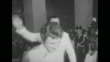 Title card: "Movie Ambassadors…Stars Over Brazil" superimposed over twinkling stars / rear end of train from front end of train as it rounds curve / stars eating at table on train / man filming out train window / actress Rhonda Fleming in train seat / actress June Haver sitting next to actor Fred MacMurray / busy downtown street shot through ornate balcony metalwork / skyline with park and weeping willow trees in fgd / CU pond with trees and bldgs in bkgd / stars exit train station and wave to crowd outside / crowd of children, girls and women with arms waving / Haver and MacMurray shake hands with children in crowd / overhead shot crowd / high angle stars greet crowd / in Washington DC, CU Eric Johnston, Motion Picture Association of America president, SOT: "...healthy competition among filmmakers is the best way to ensure improved quality for the consuming public. Clean, wholesome, motion picture entertainment means better entertainment for the families of all of the world" / LS car pulls up to building at night with crowd outside / dancer, actress Ann Miller walks up stairs at building with escort / actor Walter Pidgeon walking up steps and waving to crowd / Fleming walks up steps with husband Dr. Lewis Morrill / guard standing in front of crowd on steps / actor Edward G Robinson walks up steps and waves / Jeanette MacDonald and her husband Gene Raymond arriving / actress Irene Dunne and husband Dr. Francis Griffin walking up stairs past crowd and toward camera / cars pulling up to building / Note: exact day not known