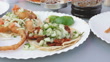 Moving Clip Variety of Street Tacos Including Shrimp, Buche and Birria Tacos and a Tostada with Chile Arbol Sauce and Consomme with Limes and Radish Nopal Cactus