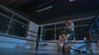 Muay Thai boxer body climb jump downward elbow strike in boxing ring match knock down opponent - 4K stock video