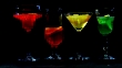 Four various cocktail glasses containing red, orange, yellow and green drinks with slices of citrus fruits standing in a row against black background
