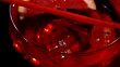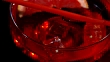 Margarita cocktail glass containing red drink with ice cubes and slice of grapefruit against black background