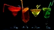 Four various cocktail glasses containing red, orange, yellow and green drinks with slices of citrus fruits standing in a row against black background