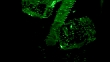 Vintage cocktail glass containing green drink with ice cubes and slice of lemon against black background