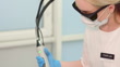 Multiracial woman in lying on a white couch getting laser epilation of legs in a cosmetology clinic. doctor cosmetologist doing hair removal procedure with alexandrite laser, close-up - 4K stock video