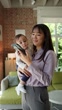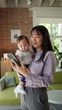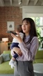 Mother managing tasks with a baby and using her phone’s voice control in a bright home.