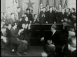MOT 1943: MUSIC UNION CONTRACT: Musicians outside Union hall. Newspaper headlines 'Petrillo Lifts Ban on Discs' INT Hall man standing waving paper men applauding. Newspaper 'Decca Signs Up With Petrillo For Four Years' SOT Petrillo about contract.