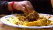 Eating routine Indian mutton (Lamb meat) curry and parboiled rice with hands.