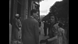 MS Myrna Loy, actress walks down street with unid man seen from behind / MS Loy turns to face camera, smiles and waves, then turns and walks off